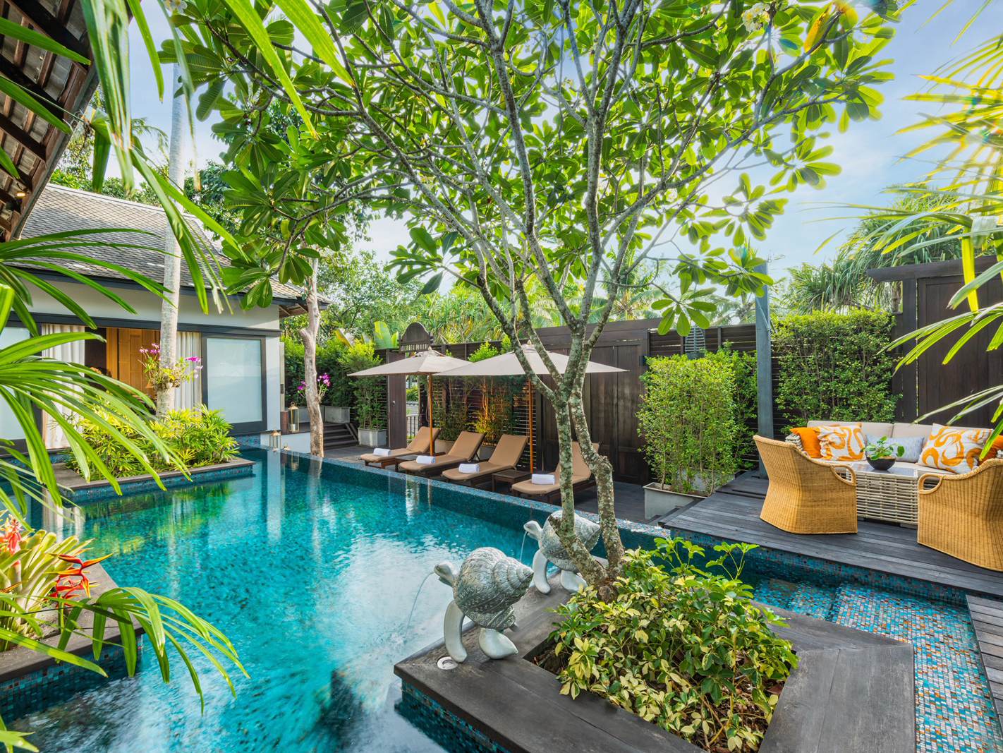 Live large at a Phuket hotel in luxurious designer surrounds. This one-of-a-kind pool villa of our Phuket luxury hotel draws inspiration from the legend of Jim Thompson, forefather of the Thai silk industry and a golden era. A classic-contemporary aesthetic of gabled roofs, hardwood flooring and panelled walls is finished with vibrant Jim Thompson fabrics and screens.